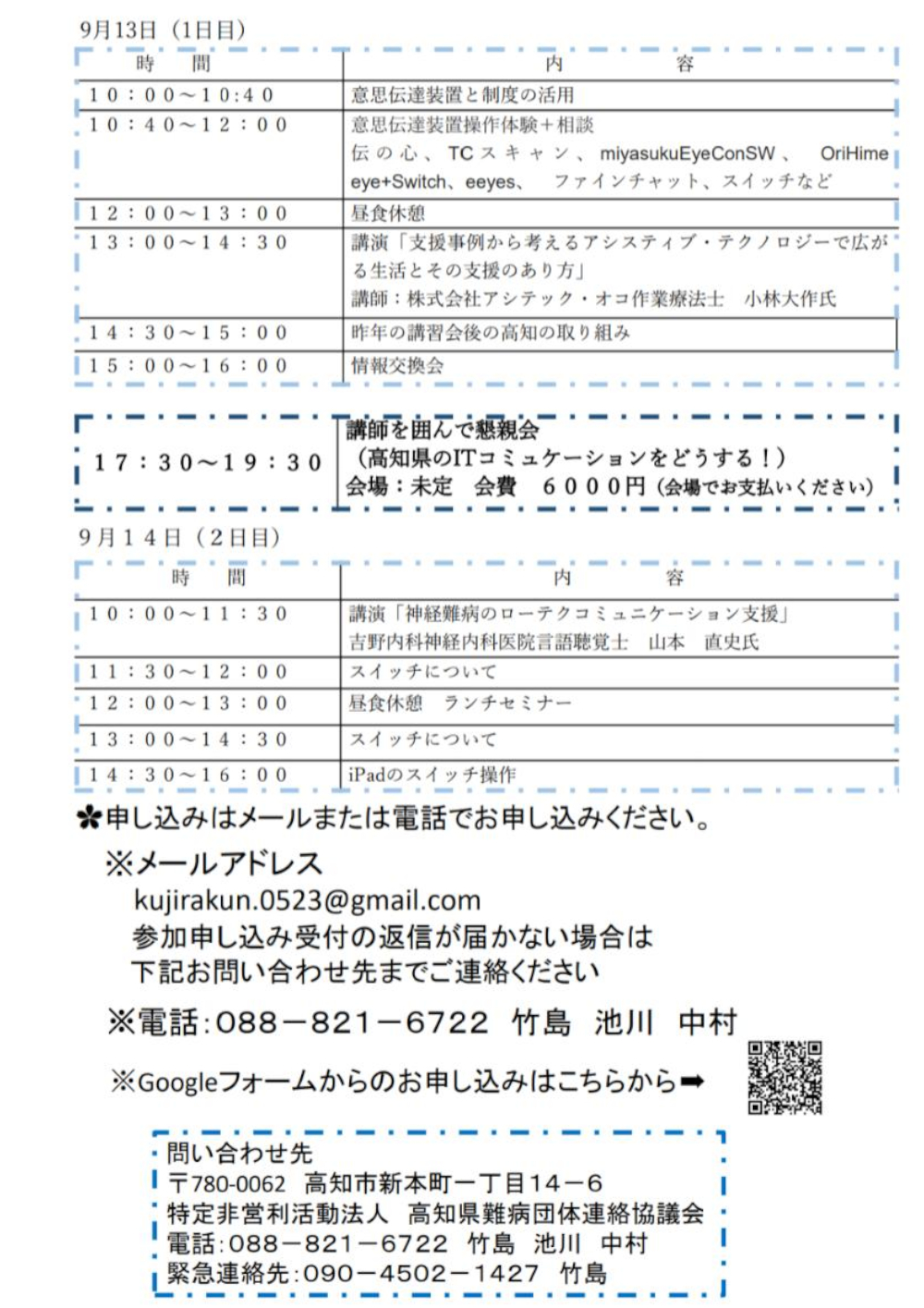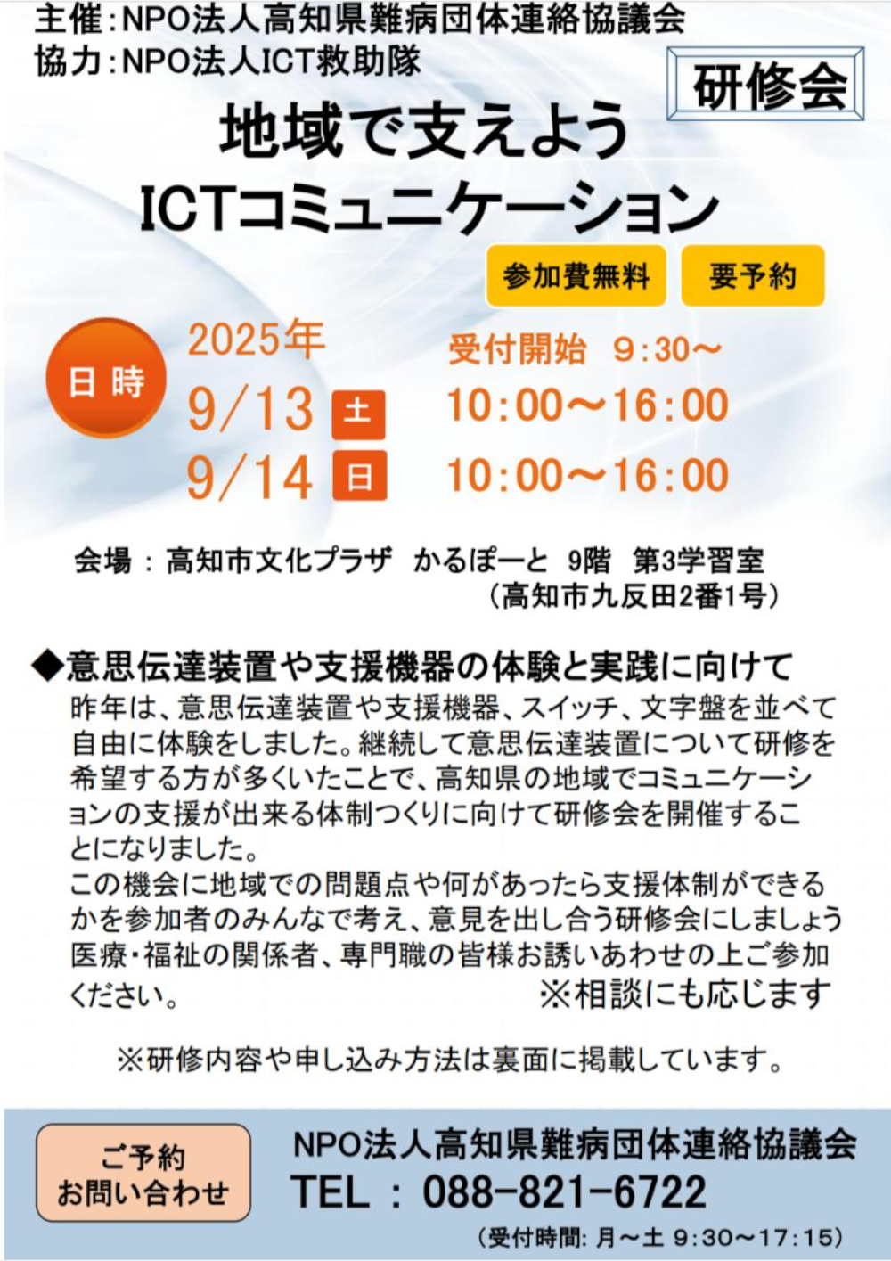 概要:NPO法人 高知県難病団体連絡協議会 主催、NPO法人 ICT救助隊 協力により開催されたICTコミュニケーションの研修会に参加しました。ICTコミュニケーションとは、「情報通信技術(ICT)を活用して、情報や知識、意見などを共有するコミュニケーション」のことです。神経疾患等により発語が困難となりコミュニケーションに支障が生じた患者さんに対して、患者さんの状態に応じたコミュニケーションツールの選び方、運用の方法について実践的なレクチャーを受けました。視線入力によるパソコン機器、iPadなど最新のIT機器だけでなく、筋力が低下した方でもIT機器を使用できように様々なタイプの入力装置(スイッチ)があること、アナログ文字盤は効率アップのために自由にカスタマイズができること、など臨床現場ですぐに活用できるコミュニケーション方法を幅広く学ぶことができました。また、当院から沖・市川が院内のコミュニケーションツールの使用状況や課題について発表し、改善に向けて同じ課題に取り組む他施設の方々と意見交換することができました。