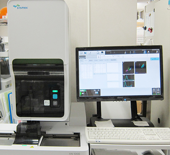 白血球数、赤血球数、Hb(ヘモグロビン)、血小板数を機械で測定し貧血や炎症などの診断に用います。